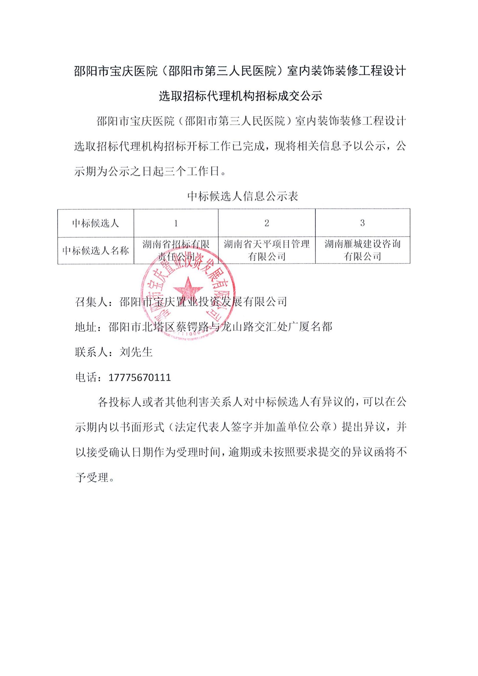 邵陽市寶慶醫(yī)院(邵陽市第三人民醫(yī)院)室內(nèi)裝飾裝修工程設(shè)計選取招標代理機構(gòu)招標成交公示