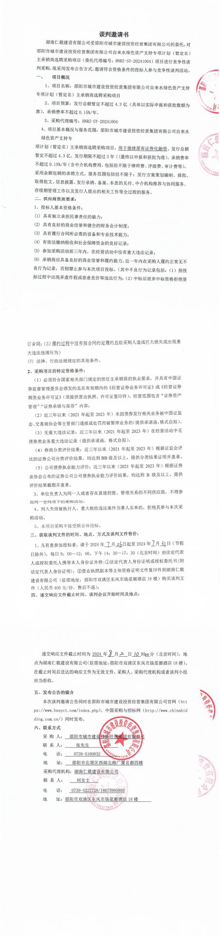 邵陽(yáng)市城市建設(shè)投資經(jīng)營(yíng)集團(tuán)有限公司自來(lái)水綠色資產(chǎn)支持專(zhuān)項(xiàng)計(jì)劃(暫定名)主承銷(xiāo)商選聘采購(gòu)項(xiàng)目談判邀請(qǐng)書(shū)