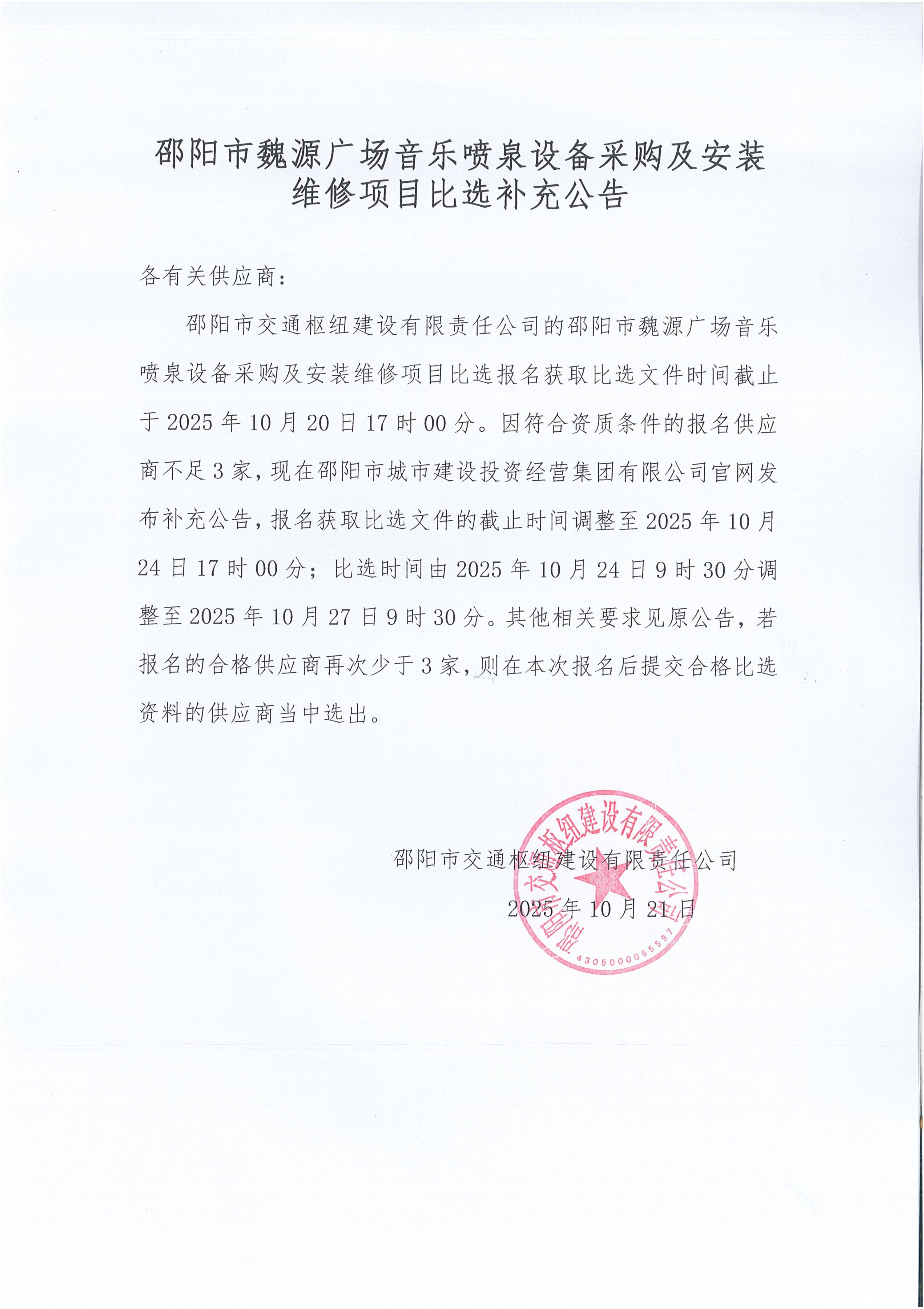 邵陽市魏源廣場音樂噴泉設(shè)備采購及安裝維修項目比選補充公告..