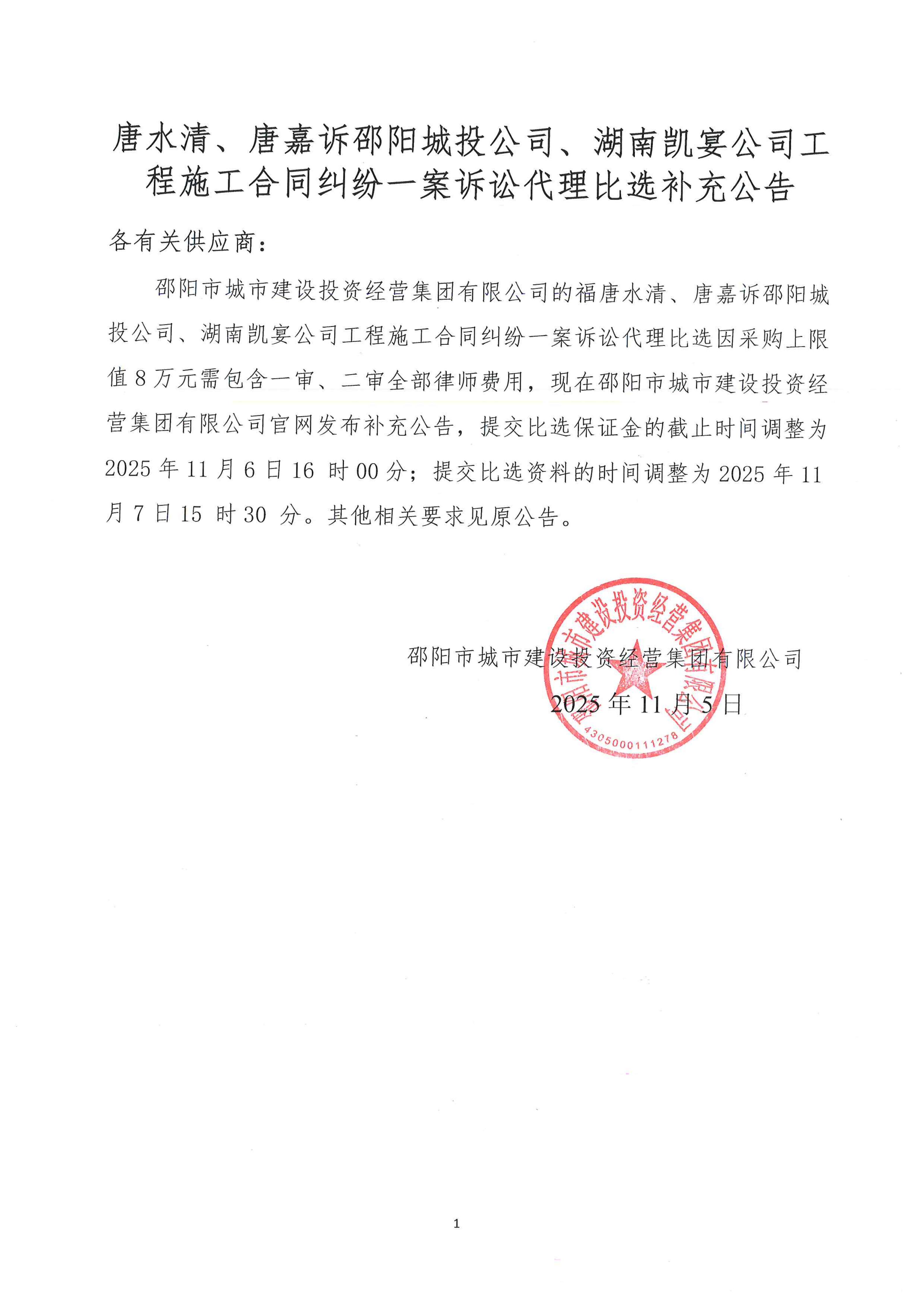 唐水清、唐嘉訴邵陽城投公司、湖南凱宴公司工程施工合同糾紛一案訴訟代理比選補充公告